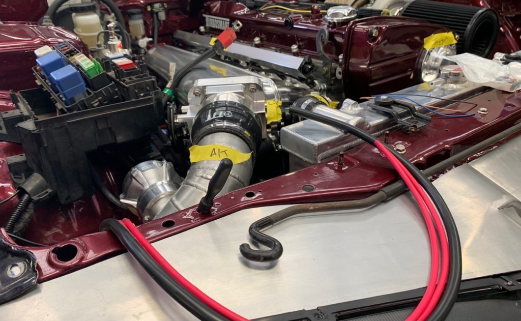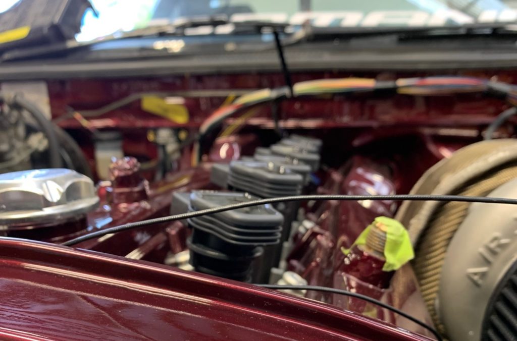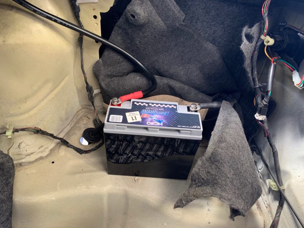 Some work on the underside of the car also required, speed sensors, earth cable etc, as well as the beginnings of the battery relocation. We’ve supplied a lightweight, very compact battery for running the vehicle. Looks are deceiving, this wee beast offers a pulse crank of 600A, more than enough to wake the big six cylinder up, even on the coldest mornings! Large diameter Ground and Power cables ensure minimal voltage drop for rapid cranking and less strain on the alternator.