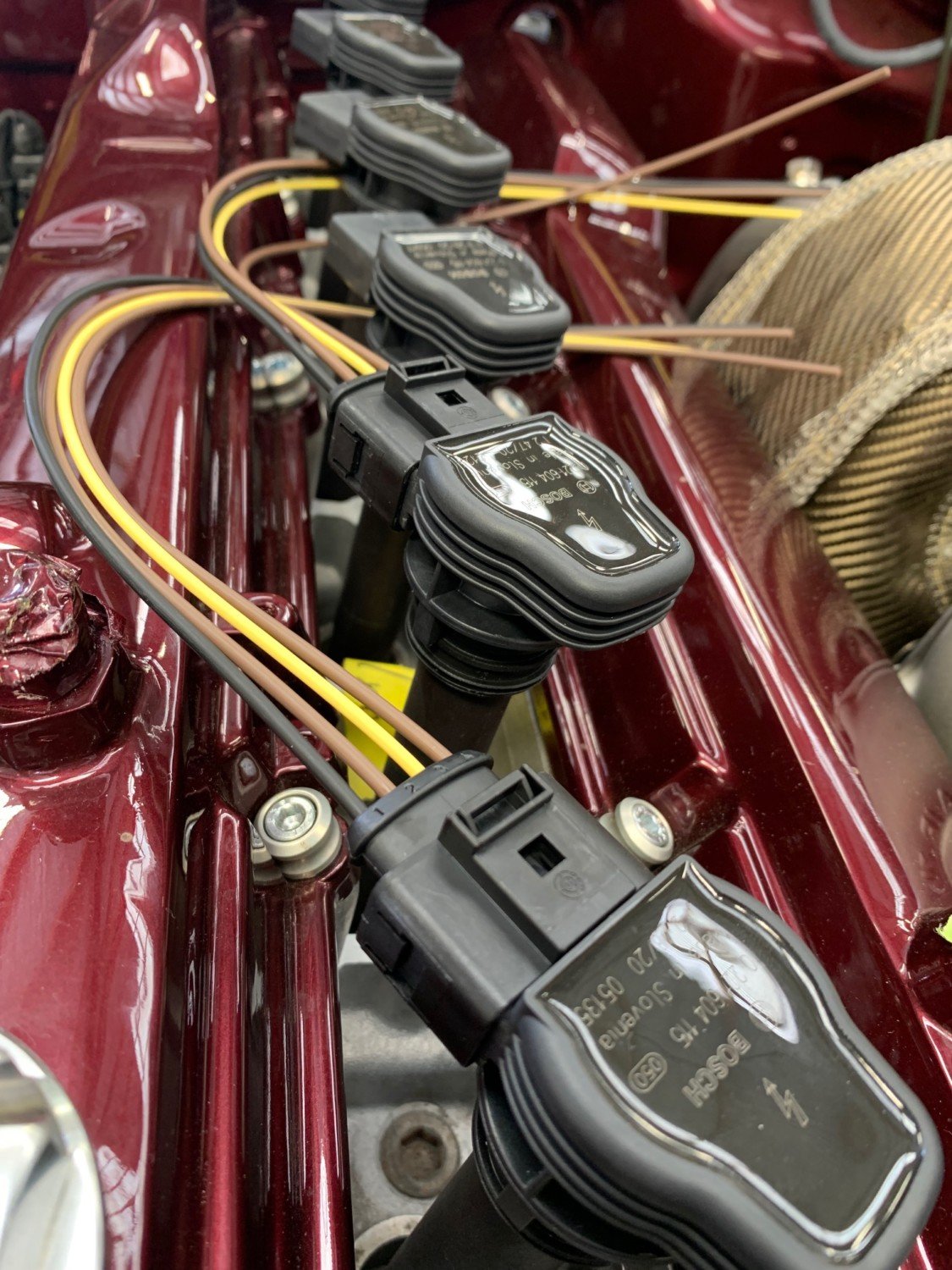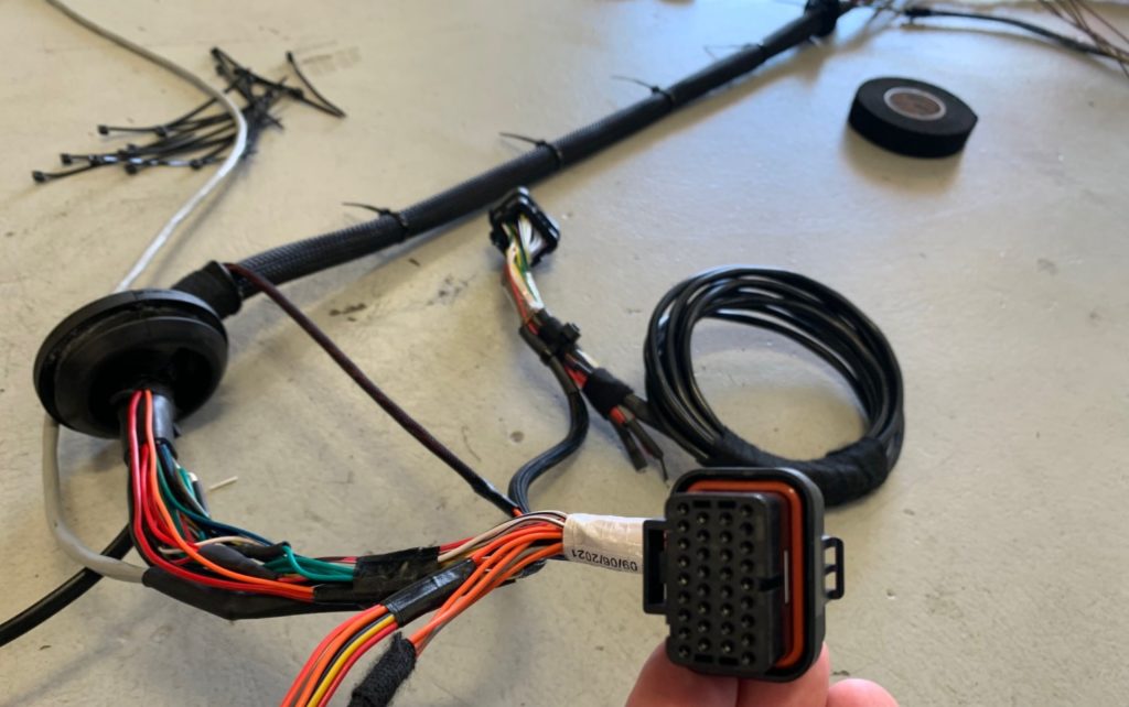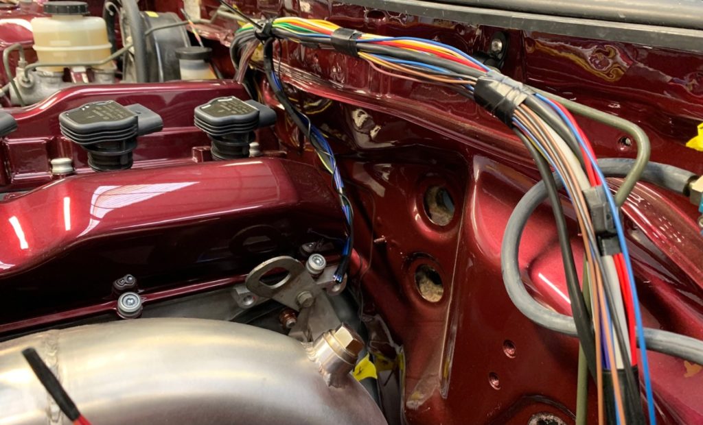 Below: A big job ahead, initial work. Coil Loom coming together, Earth and Power Cables Waiting for Terminals. Main Harness gets its final Loom Wrapping before Braid goes on and Final Fitment in place. Battery relocation to boot is on the cards too for this Street and Track Weapon. The LINK ecu has been mounted neatly in the factory location, adding to the OEM nature of the install.