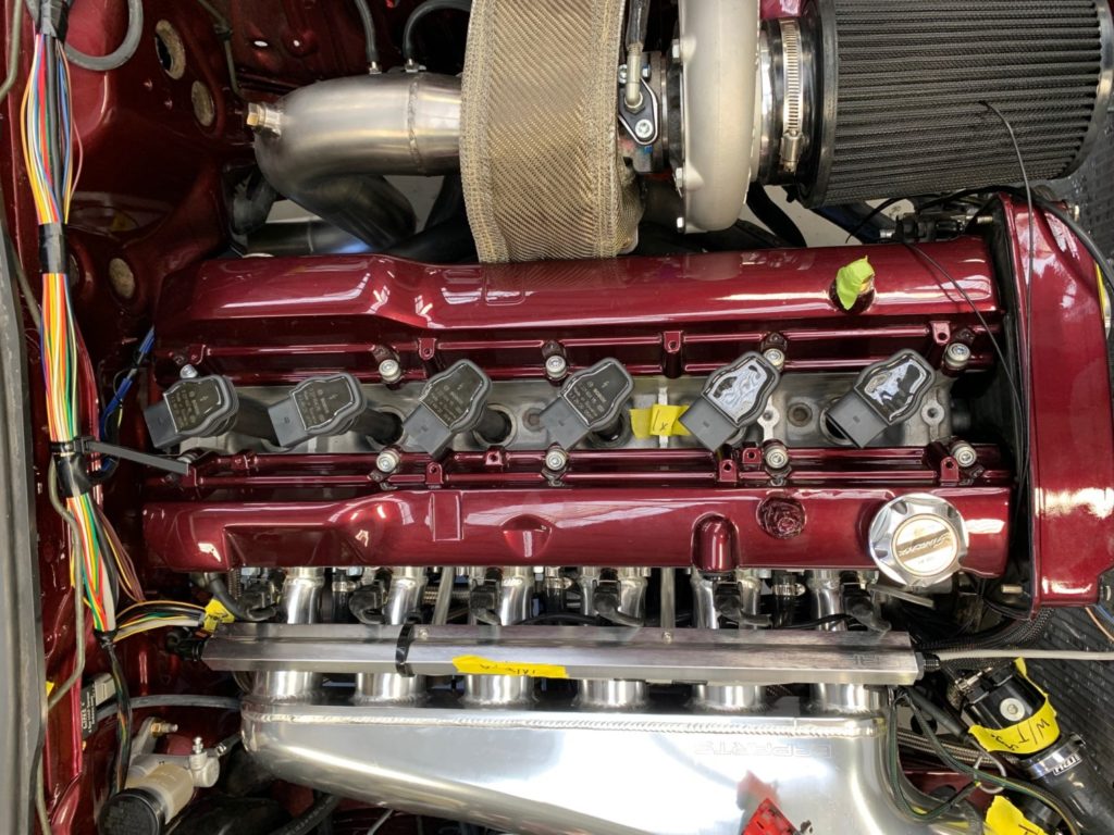 Boost is provided by a Garret GT35/82R and a 50mm TurboSmart External Wastegate keeps Boost levels in check. Intake Temps are kept in check with an Aeroflow Performance Front Mounted Intercooler.